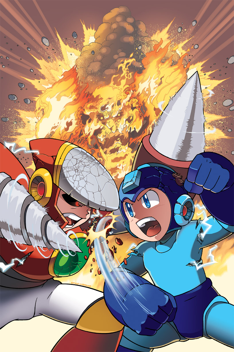 As always, Spaz's attention to detail and the precision with which he draws the official Mega Man style makes him a pleasure to work with - check out Dr. Wily's face in the flames of that explosion! I'm actually in the midst of coloring the interiors for this issue right now, and the story fully lives up to this epic cover!